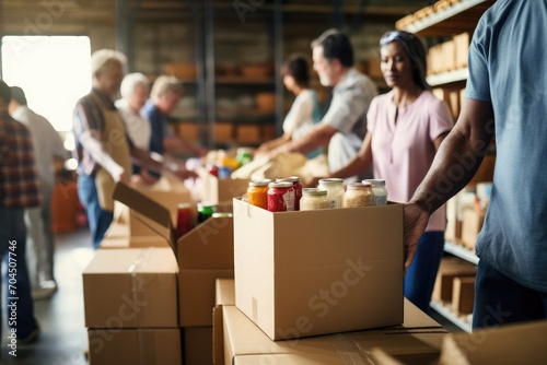A group of unrecognizable people volunteering at a local food bank showcasing compassion generosity and community service.