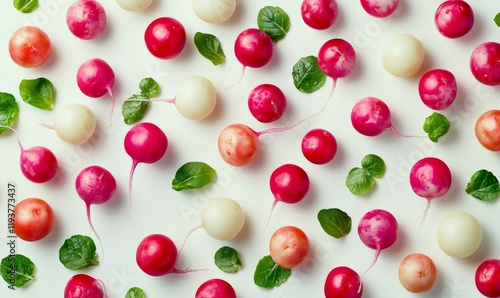 A group of vibrant radishes with contrasting colors on a white background, vegetarian dishes, nutritious snacks, food styling