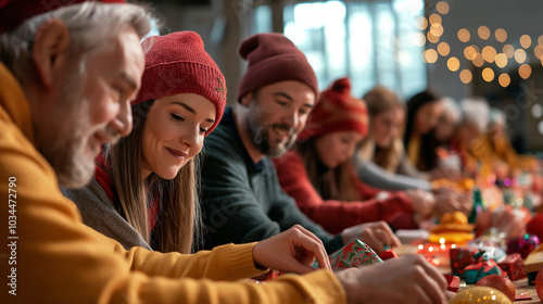 A group of volunteers wrapping presents for charity, surrounded by colorful wrapping paper and festive decorations – An inspiring scene of working for the benefit of society, shari