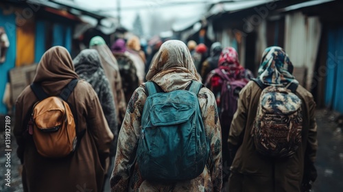 A group of women in colorful headscarves walks together in a marketplace, showcasing cultural diversity and community spirit through their vibrant clothing and shared experience.