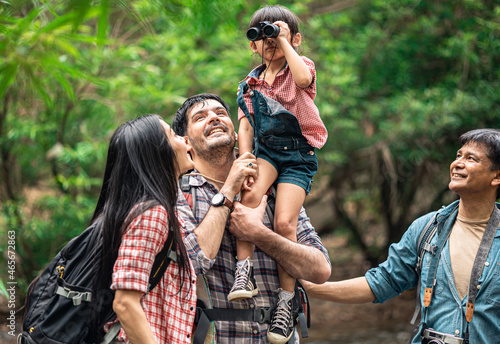 A group of young Asians are planning and looking at maps for camping in the forest.Asian and caucasian are backpackers.Tourism, adventure and summer vacation concept