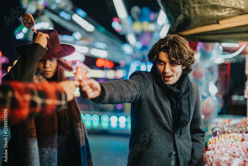 A group of young friends having fun and enjoying candies at a winter fair with colorful lights.