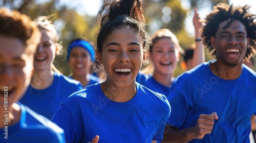 A group of young people joyfully running outdoors in blue shirts.