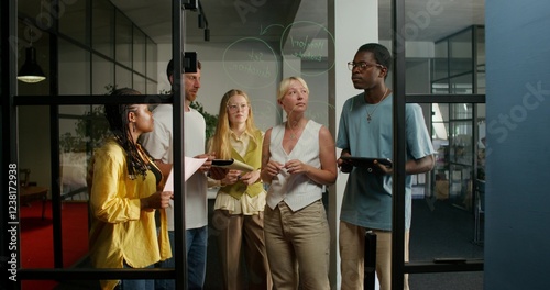 A group of young people of different nationalities are talking standing near a glass board with notes. Business planning. Daylight