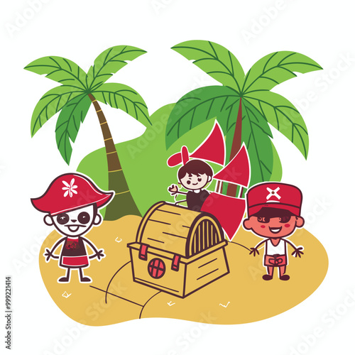 A group of young pirates have discovered a treasure chest on a tropical island, surrounded by palm trees