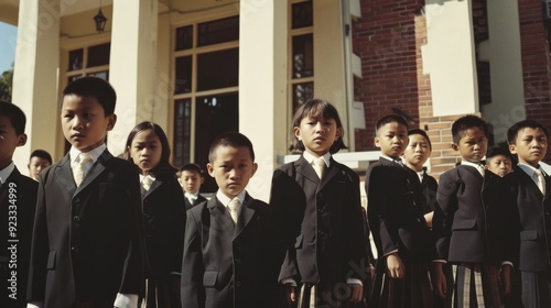 A group of young students in formal black uniforms standing in front of an institutional building, sharing serious expressions in an organized formation.