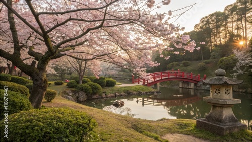 A grove of cherry blossoms in full bloom with a tranquil pond