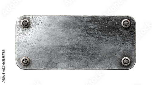 A grungy, rectangular metal plate is mounted on a transparent background with rivets at each corner, PNG