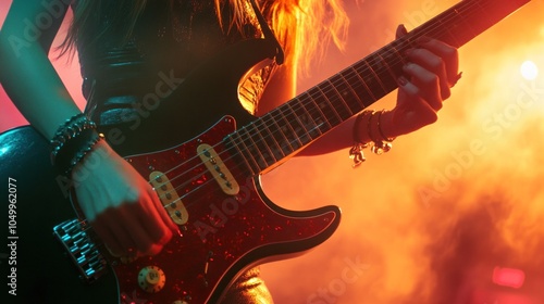 A guitarist performing on stage with vibrant lighting and a focus on their hands and guitar.