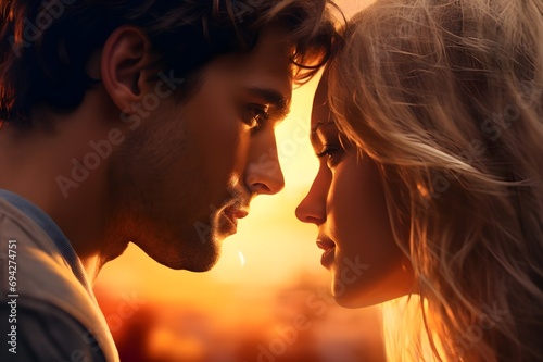 A guy and a girl at sunset look at each other with loving eyes.A couple in love looks at each other.Portrait at sunset.Love