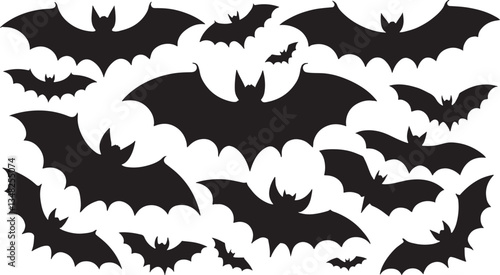 A Halloween bat set with silhouettes flying against a dark night sky, featuring a spooky and seamless pattern of bats, moon, and other Halloween-themed elements