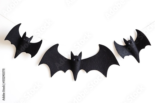 A halloween decoration featuring three black paper bats hanging against a white background wall