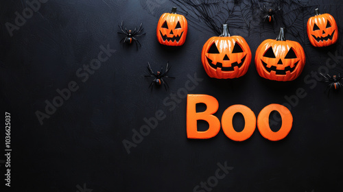 A Halloween-themed image featuring carved pumpkins and the word "Boo" in orange against a black background.