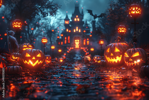 A Halloween-themed mockup featuring spooky elements such as ghosts, bats, and a haunted house. Perfect for promotional materials, party invitations, or social media posts.