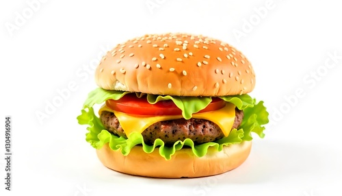 A hamburger made up of cheese, sweet pepper, lettuce and burger, on a white background