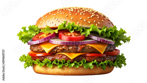 A hamburger on a white background with cheese, lettuce, tomato, meat, and a sesame seed bun