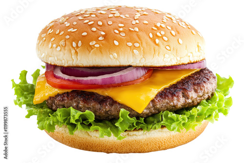 A hamburger with lettuce, onions, and cheese , isolated on white background