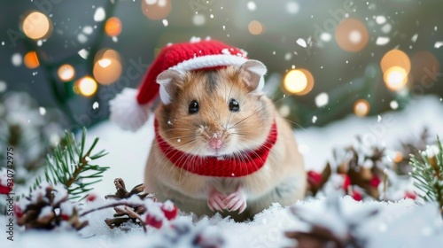 A hamster in a trendy winter outfit, posing in a festive holiday setting