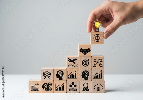A hand arranging wooden blocks symbolizing business growth and achievement with an illuminated light bulb on top.