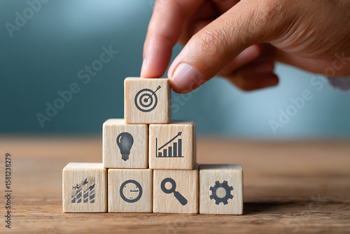 A hand carefully placing a light brown wooden block with a dark gray target symbol onto a pyramid structure of similar blocks each