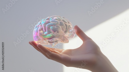 A hand cradles a holographic brain, shimmering with colors, against a bright white background