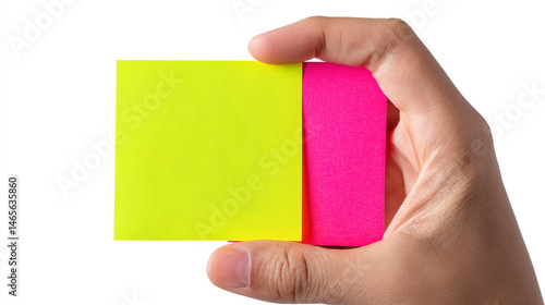 A hand delicately holding a vibrant collection of sticky notes against a plain white backdrop.