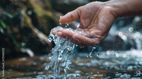 A hand gently scoops up fresh, clear water from a bubbling stream, symbolizing purity and nature's simplicity.