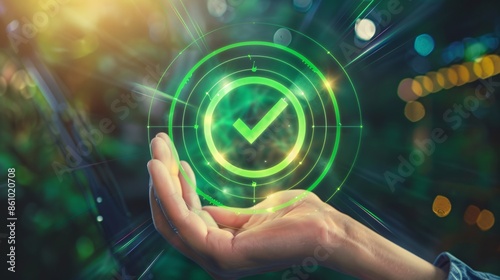 A hand grasping a green tick in a ring with a delicate glow, symbolizing quality assurance, endorsement and achievement.