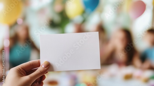 a hand holding a blank birthday card with blurred birthday party in the background.
