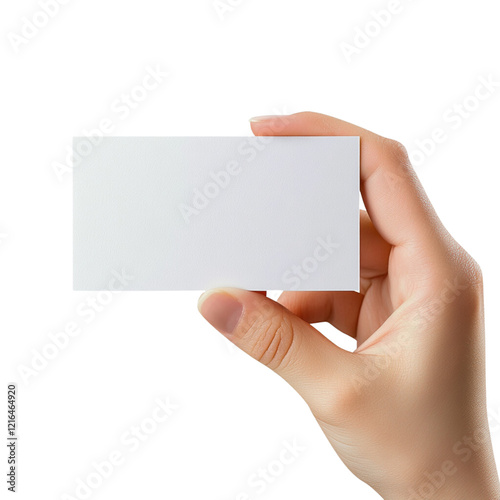 A hand holding a blank business card, isolated on a transparent background