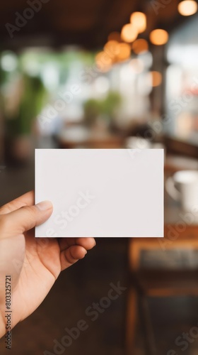 A hand holding a blank white card against a blurred background of a coffee shop.