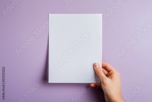 A hand holding a blank white sheet of paper against a pastel purple background. Useful for mockups, message display, or minimal graphic design concepts.