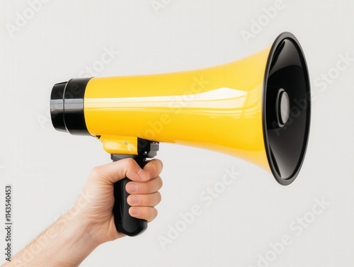 A hand holding a bright yellow megaphone, commonly used for amplifying sound or delivering messages in public settings.