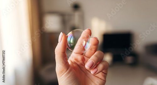 A hand holding a clear iridescent sphere with a blurred background in a brightly lit room indoors