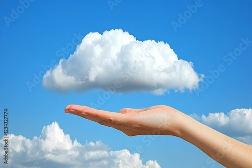 A Hand Holding a Fluffy White Cloud Against a Vivid Blue Sky