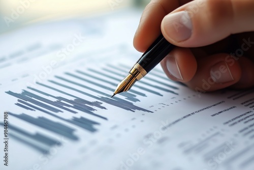 A hand holding a fountain pen over financial documents featuring detailed graphs and data analysis during a corporate meeting