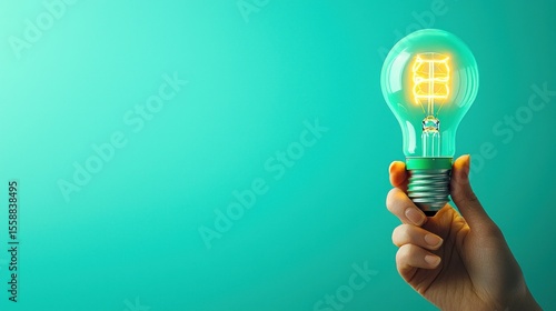 A hand holding a glowing lightbulb against a teal background, symbolizing ideas and innovation.