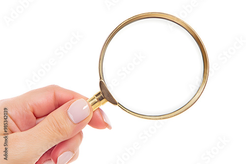 A hand holding a magnifying glass, symbolizing discovery or attention to detail
