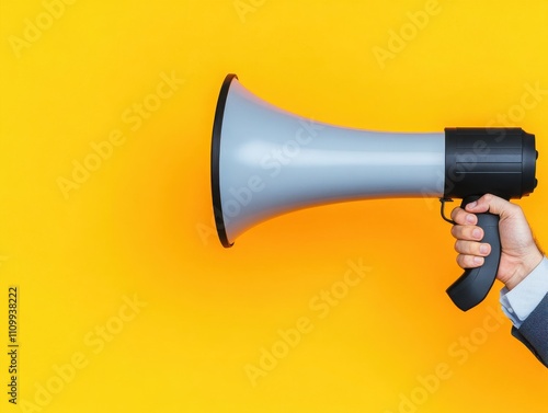 A hand holding a megaphone against a bright yellow background, symbolizing communication and announcement in a professional context.