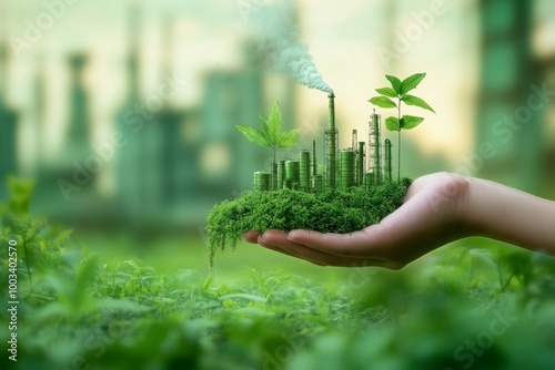 A hand holding a miniature green city on a mossy platform surrounded by lush nature and industrial buildings in the background