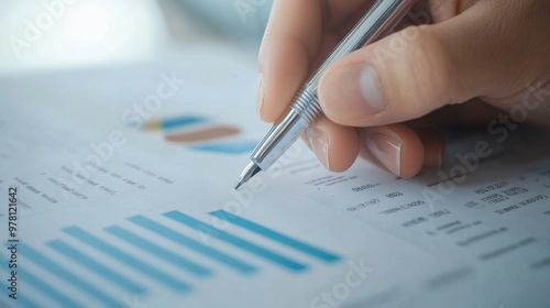 A hand holding a pen, pointing to a bar graph on a printed financial report, analyzing key data points.