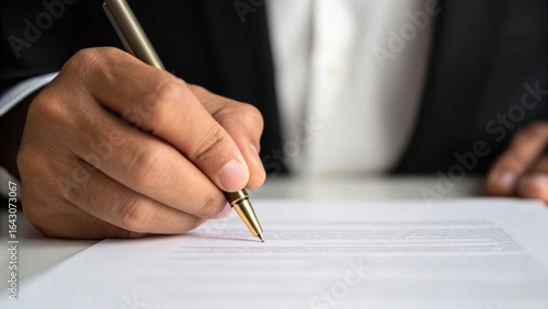 A hand holding a pen, poised over a document, suggesting the act of signing or writing important information.