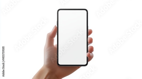 A hand holding a phone with a white screen. The phone is not turned on and has no apps