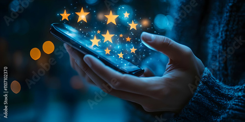 A hand holding a smartphone with glowing stars, symbolizing digital interaction and creativity.