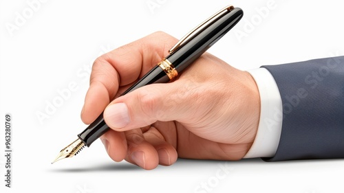 a hand holding an elegant fountain pen, ready to write on a blank page, symbolizing creativity and professionalism.