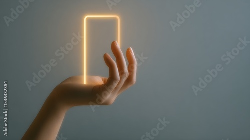 A hand holding an illuminated smartphone outline against a soft background.