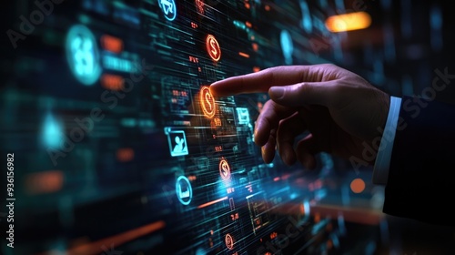 A hand holding digital symbols representing money in a virtual environment, emphasizing modern financial technology and digital currency...