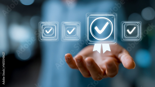 A hand holding virtual screens with a checkmark icon and a badge medal for quality, standard, or safety