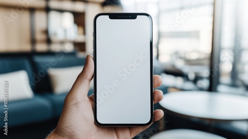 A hand holds a blank smartphone in a stylish cafe, surrounded by comfortable seating and large windows, allowing natural light to fill the space