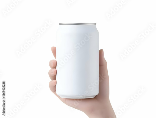 A Hand Holds a Blank White Aluminum Can Mockup, Ideal for Beverage Packaging Designs and Advertising Illustrations.